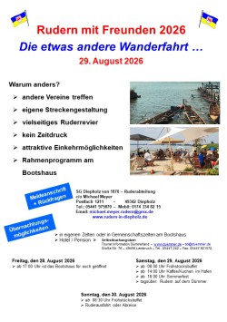 Da sich dieses Format „Rudern mit Freunden“ in den 3 vergangenen Jahren bewährt und großen Anklang bei allen Beteiligten gefunden hat, wollen wir dies auch in unserem Jubiläumsjahr (50 Jahre Ruderabteilung) beibehalten.
